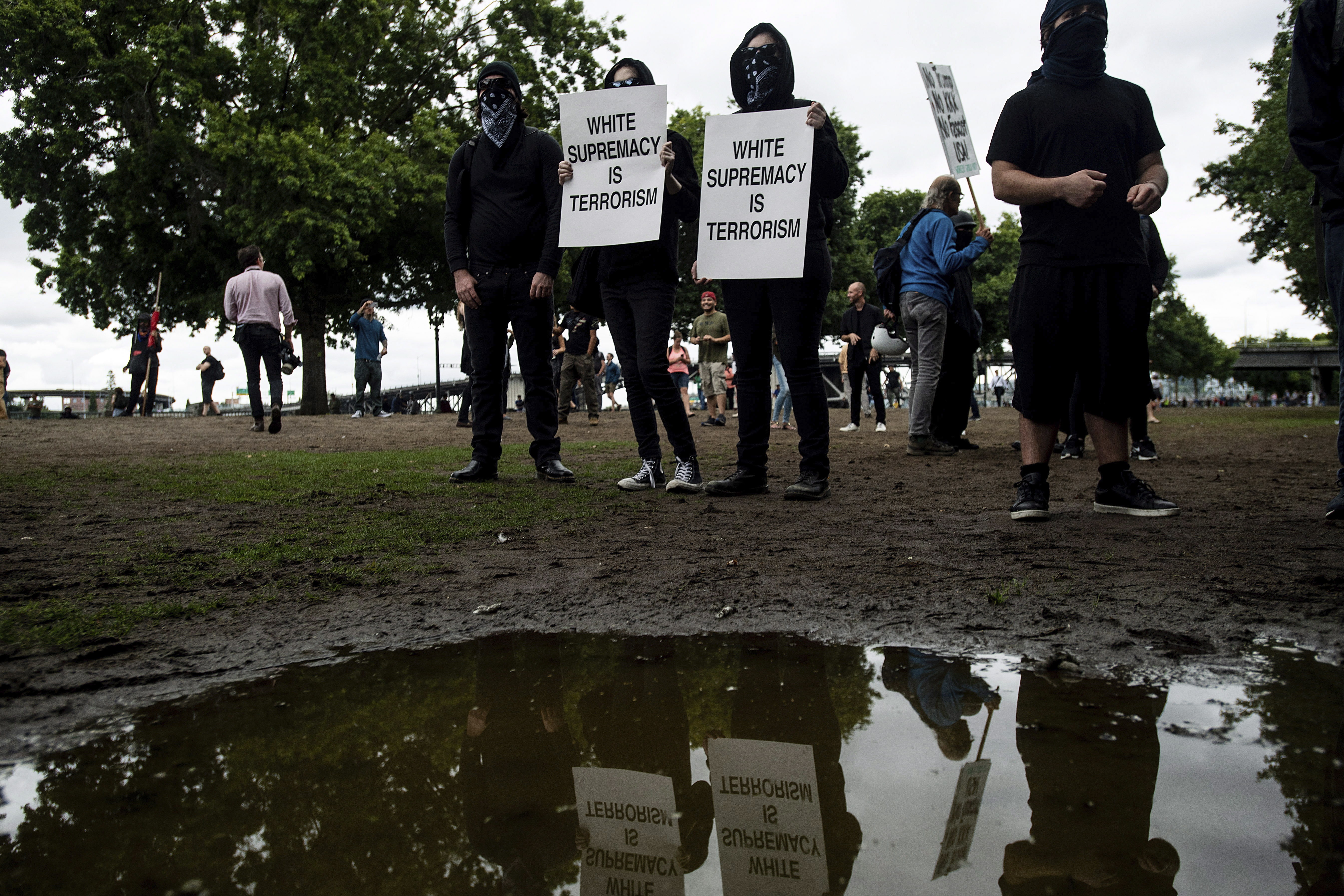 As of early afternoon, most of the right-wing groups had left the area via a downtown bridge. Police used officers on bikes and in riot gear to keep black-clad, helmet- and mask-wearing anti-fascist protesters – known as antifa – from following them.