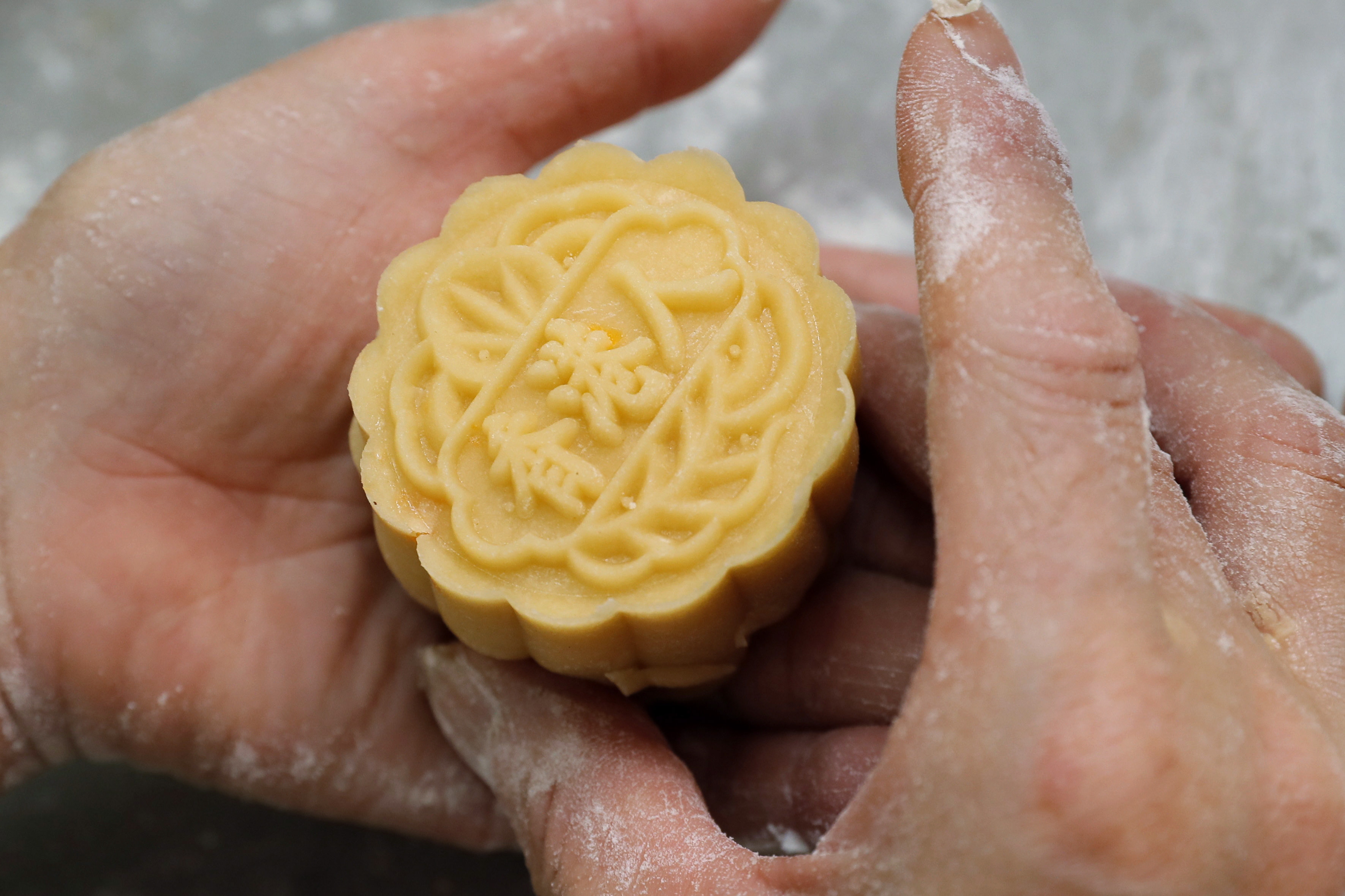 Suen’s mooncakes carry messages including “No withdrawal, no dispersal” and “Hong Kong people.”