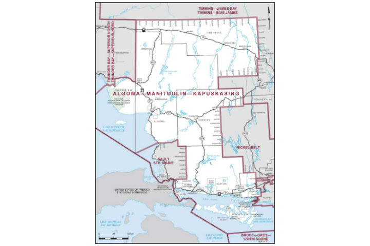 The Algoma–Manitoulin–Kapuskasing riding, which started in 2004, is comprised of much of the District of Algoma, part of the Thunder Bay district, parts of the Sudbury district, Manitoulin and part of the Cochrane district. It borders the ridings of Timmins–James Bay, Nickel Belt, Sudbury, Bruce–Grey–Owen Sound, Sault Ste. Marie and Thunder Bay–Superior North.