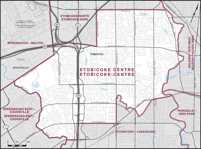 The riding is part of the City of Toronto and its rough boundaries are Etobicoke Creek, Eglinton Avenue West and Martin Grove Road to the west, Dixon Road to the north, the Humber River and Dundas Street West to the east and Bloor Street West to the south.