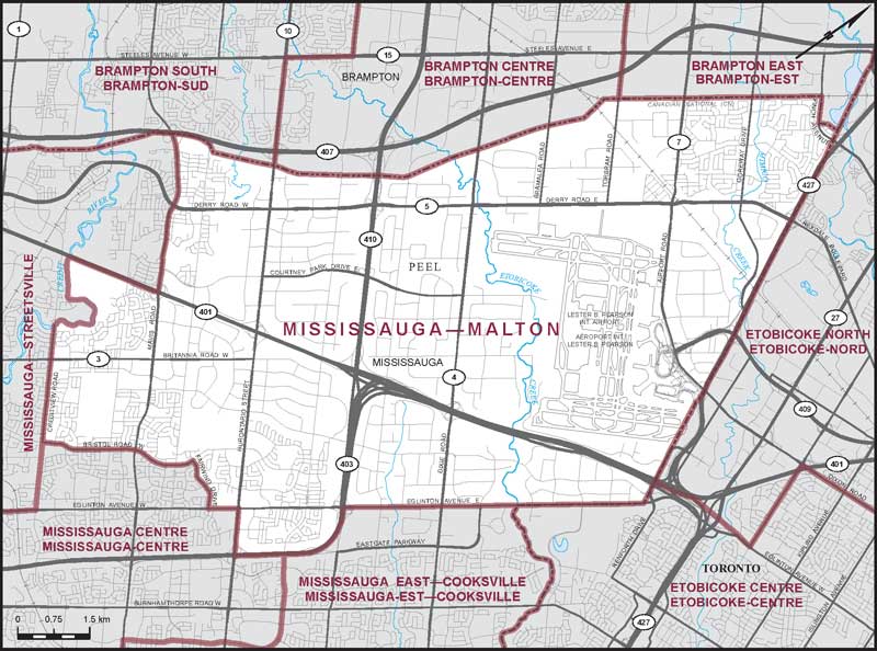 The riding of Mississauga—Malton was created ahead of the 2015 federal election as a part of a riding redistribution process that saw new ridings created and several existing riding boundaries changed. Mississauga—Malton is made up of the eastern part of the old Mississauga—Streetsville riding, a large part of the old Mississauga—Brampton South riding and the southern part of the old Bramalea—Gore—Malton riding.
