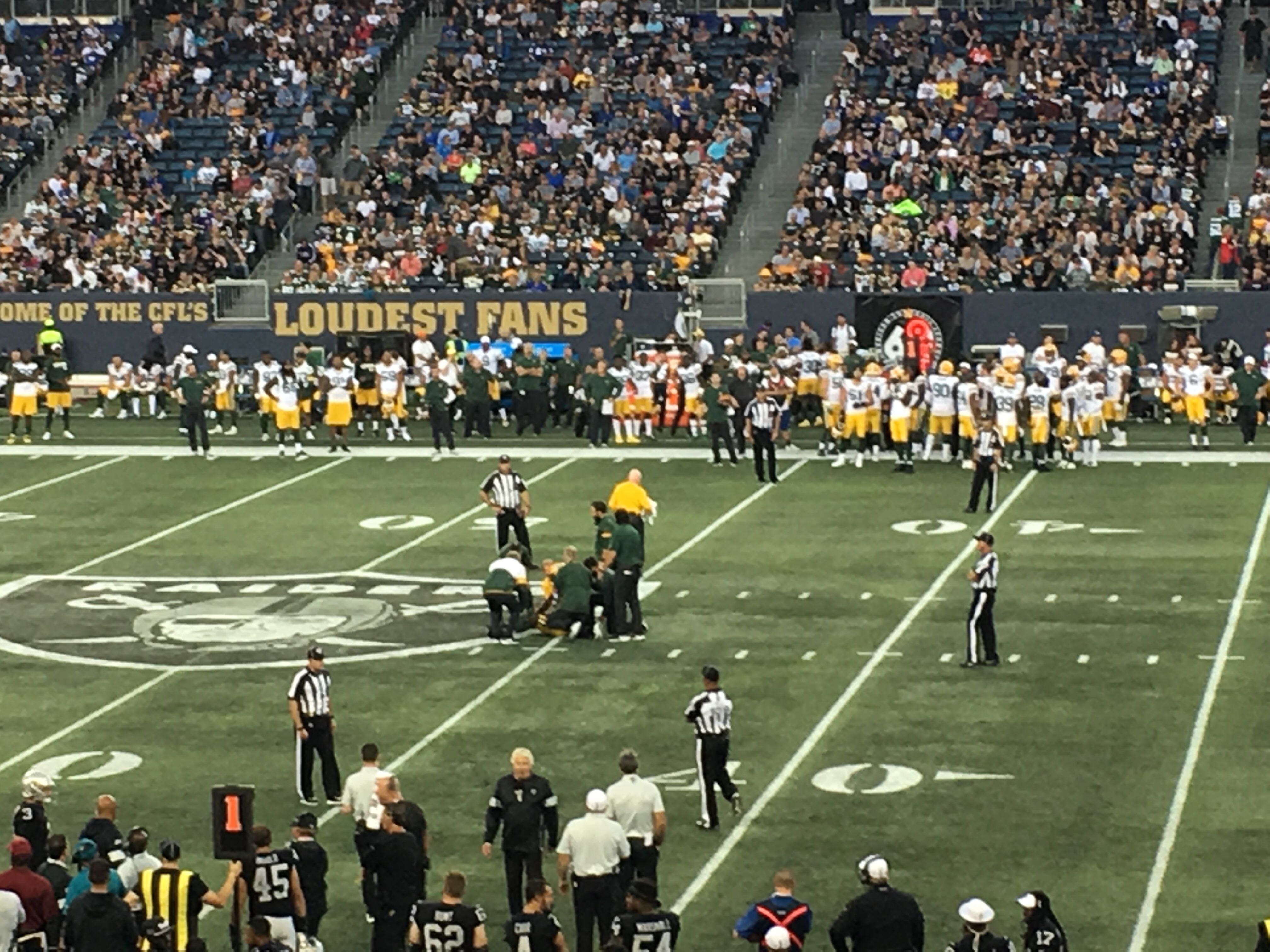 “(The field) definitely looks odd,” said Winnipeg native and fan Chris Sellar, who was sporting a Packers jersey, cheesehead hat and a green plaid kilt. “My disappointment is that the starters they promised were playing didn’t play, Aaron Rodgers, Aaron Jones.”