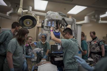 A few minutes later, a red bracelet is issued. That patient is a high-tech mannequin missing its lower left leg. Blood spews from the dummy’s limb as it is wheeled into the nearby trauma bay.