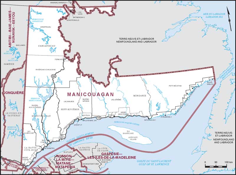 Boundaries: This riding in eastern Quebec runs along the St. Lawrence river, and north to surround the boundaries of Labrador. It includes Sept Iles and Baie Comeau. It has expanded slightly to the southwest in this election to include La Haute Cote-Nord.