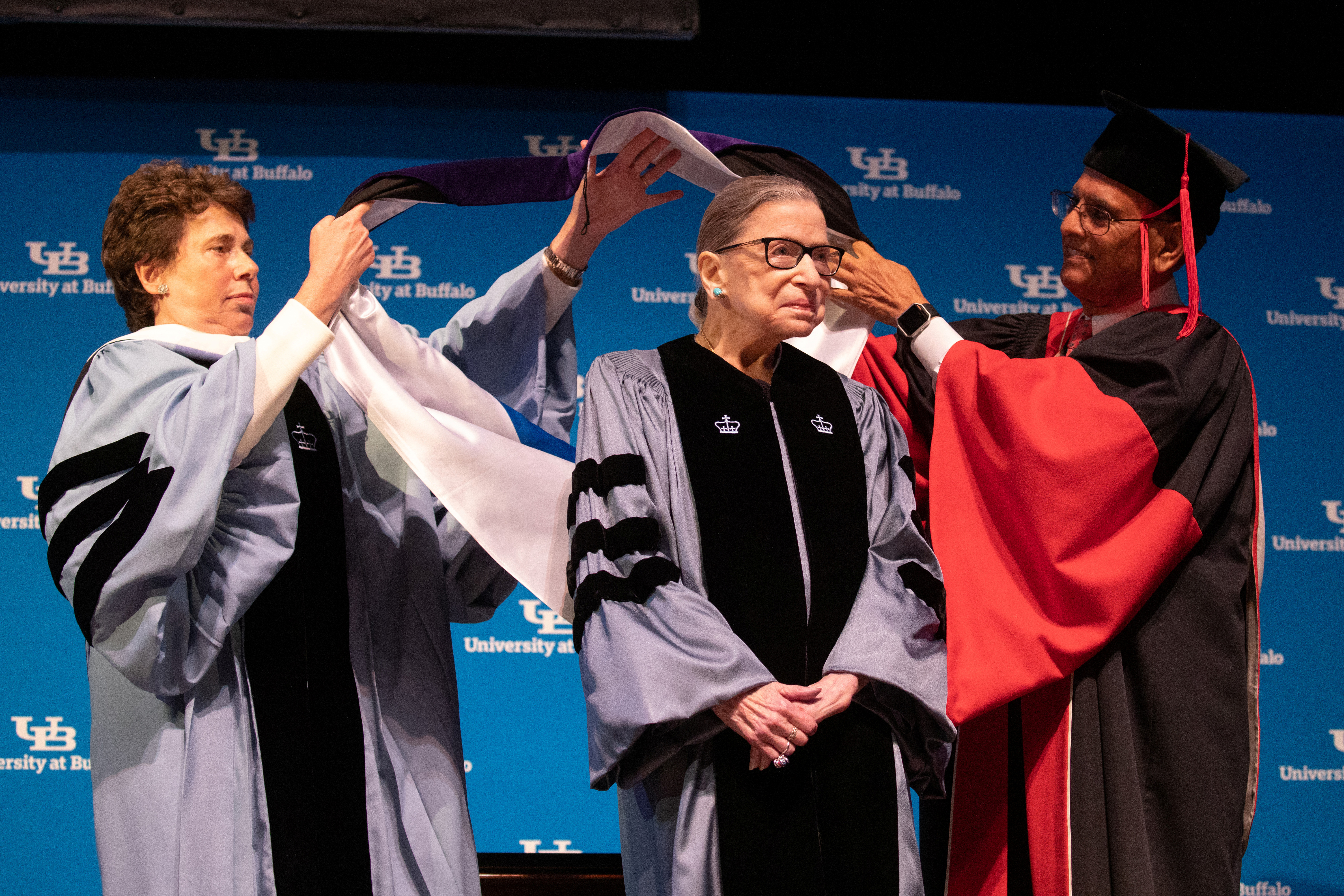 The 86-year-old justice, who has had several previous cancer scares, was escorted onstage but at times stood unassisted as she was awarded an honorary the degree at the University at Buffalo of the State University of New York.