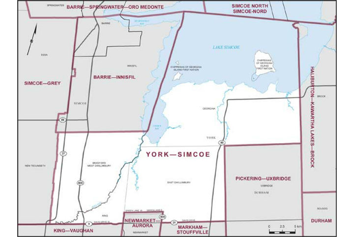 The York–Simcoe riding, which was established in 2004, is comprised of Georgina, much of East Gwillimbury, part of King Township, the Chippewas of Georgina Island First Nation Reserve and Bradford West Gwillimbury. The district borders Barrie–Innisfil, Barrie–Springwater–Oro-Medonte, Simcoe North, Haliburton–Kawartha Lakes–Brock, Pickering–Uxbridge, Markham–Stouffville, Newmarket–Aurora, King–Vaughan and Simcoe–Grey.
