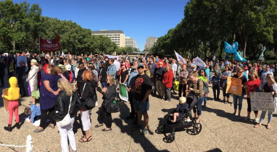 A group of teachers, teachers’ aides and their supporters rallied at the Alberta legislature Wednesday at noon to protest the composition of a panel chosen by the United Conservative government to re-evaluate the school curriculum.