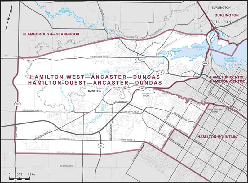 A sprawling suburban area to the west of Hamilton’s centre, this riding includes Ancaster and Dundas, and the areas southwest of Mohawk College. It has a riding population of around 109,535.