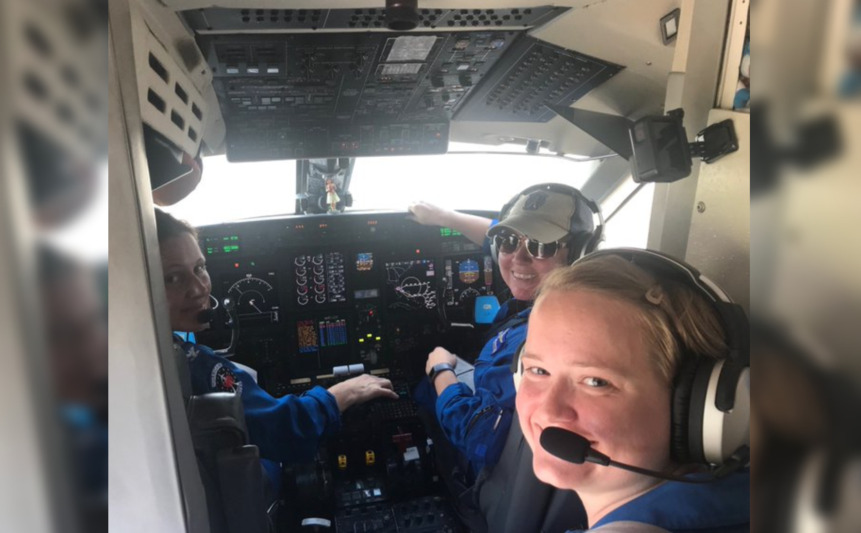 Along with the announcement, NOAA shared a photo of the three women in the cockpit, wearing blue uniforms and headpieces to communicate.
