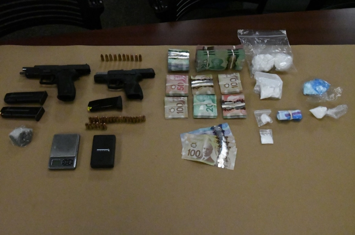 Police say they seized two loaded 9mm handguns and 51 rounds of ammunition for the firearms. They also seized, 165 grams of cocaine, worth $16,500, and 2,516 grams of marijuana, worth $25,160, as well as various drug paraphernalia, police say.