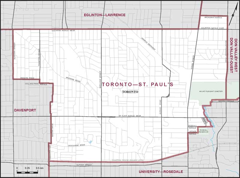 The riding is bordered by Ossington Avenue, Winona Drive, Rogers Road and Dufferin Street to the west, Eglinton Avenue West, Yonge Street and Broadway Avenue to the north, Mount Pleasant Road, Mount Pleasant Cemetery, the Don River, Rosehill Avenue, Jackes Avenue and Yonge Street to the east, and the CP Rail corridor (near Dupont Street) to the south.