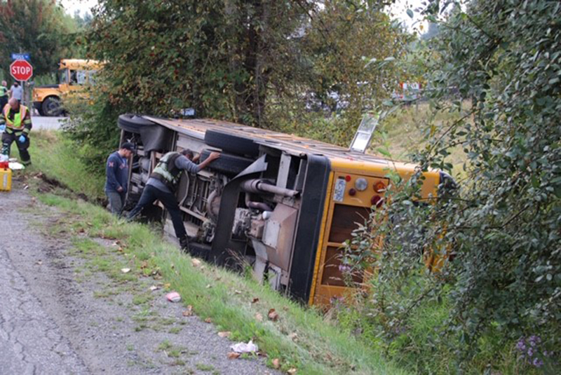 The school bus, which was being used to transport workers to an undisclosed farm in the area, ended up on its side in the ditch.