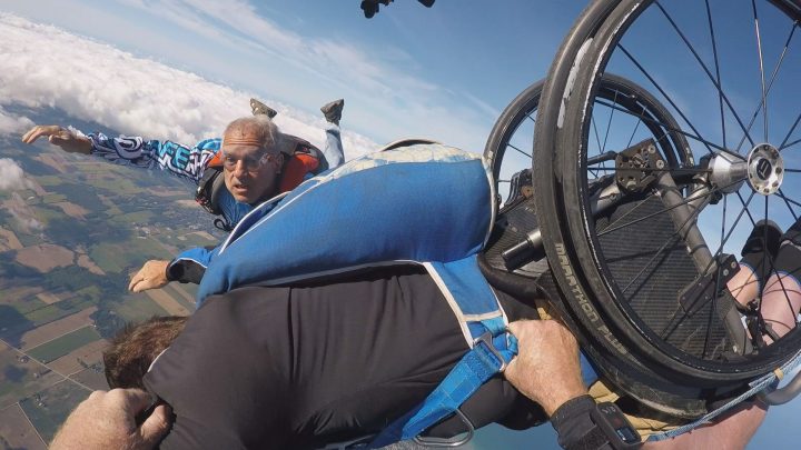 And he did this Saturday, when he took part in the 2019 Skydiving National Championships in Wasaga Beach, taking his skydiving experience one step further — by strapping himself into his wheelchair.