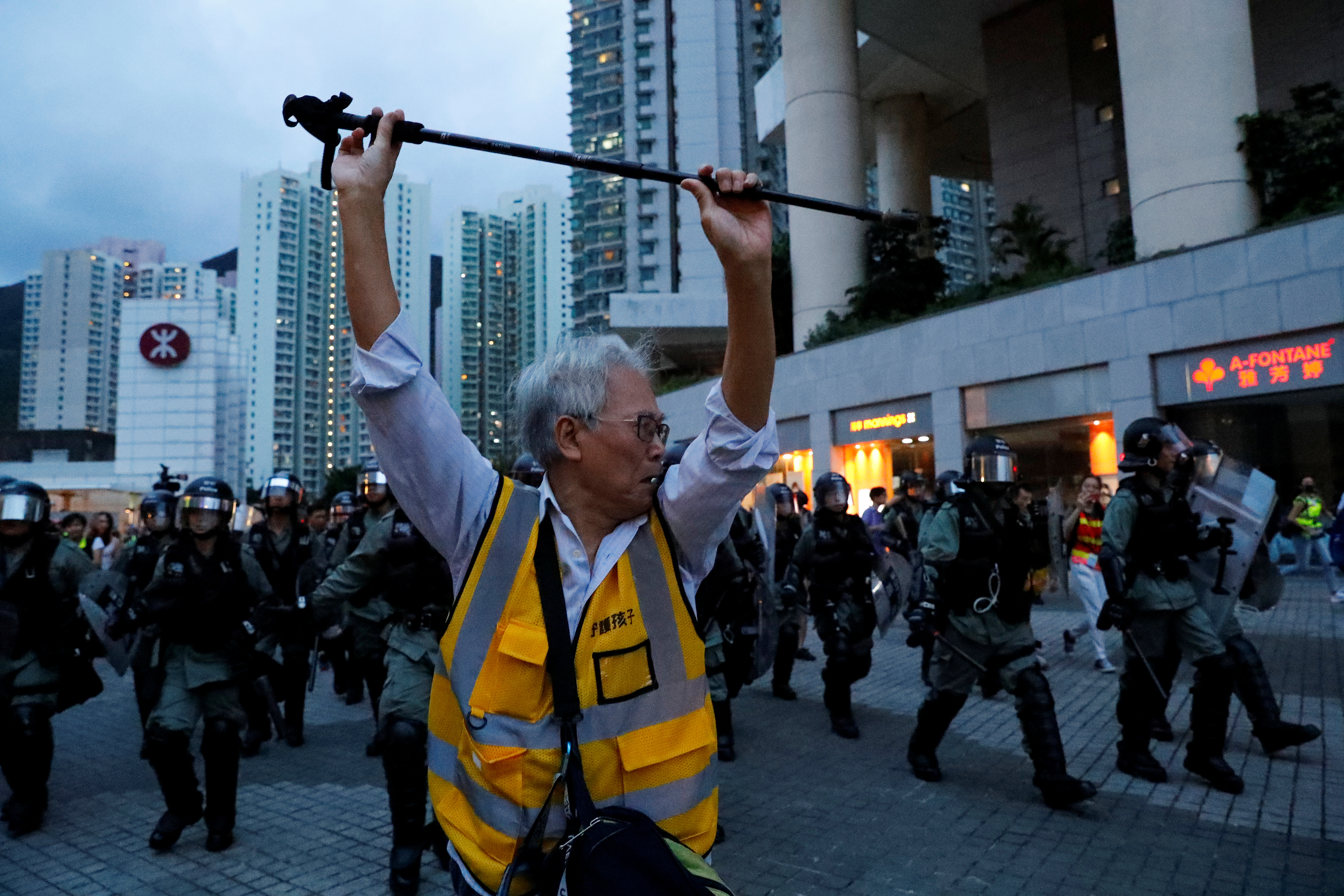 Many primary schools were closed due to a typhoon warning and some older children went to school in hard hats. University students, who have often led the protests, were expected to swap classes for demonstrations later in the day.
