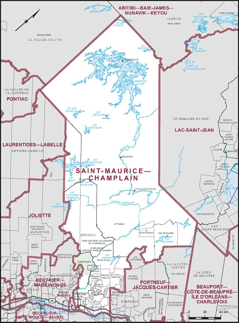 Boundaries: A large riding immediately to the north of the St. Lawrence and east of Trois-Rivières, the riding’s main population centre is Shawinigan, but also extends far north, including the regional county municipalities of Le Haut-Saint-Maurice, Les Chenaux and Mékinac. The riding gained the eastern rural areas of Trois-Rivières through redistribution.