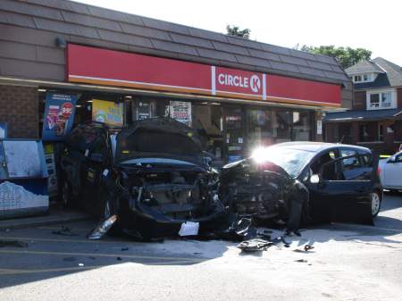 Hamilton police are investigating a two-vehicle crash into Circle K storefront in the east end on Thursday afternoon.