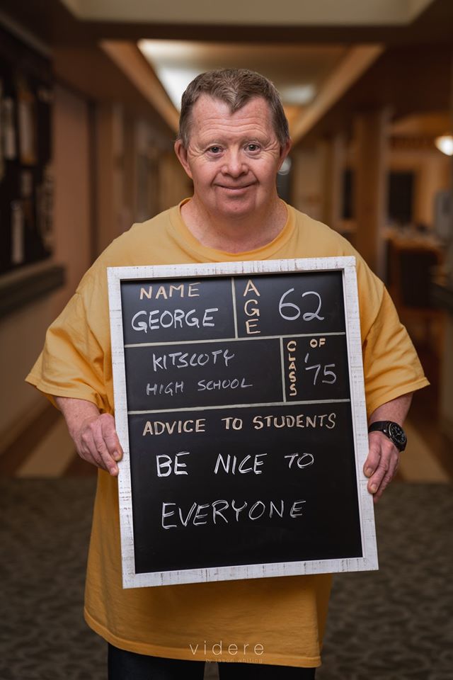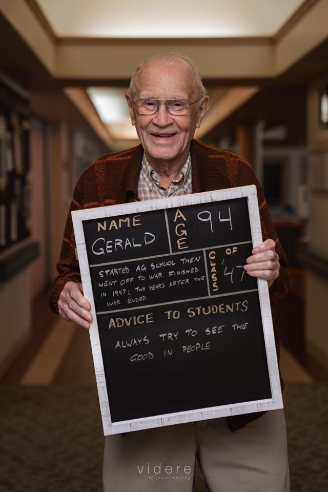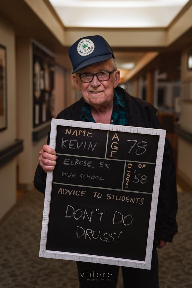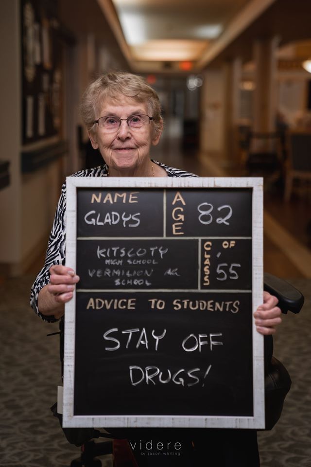 Each of the seniors pictured held up message boards with their name, age, where and when they graduated and some advice for students.