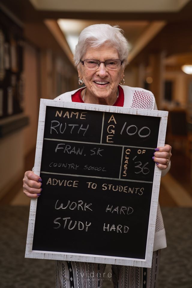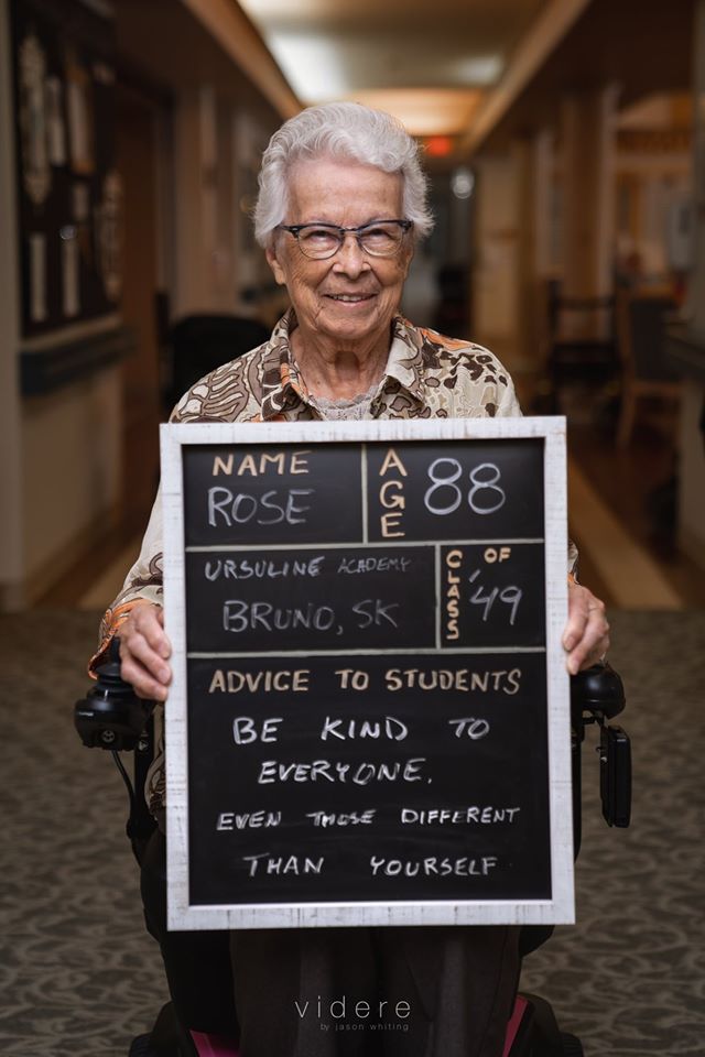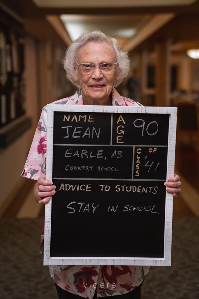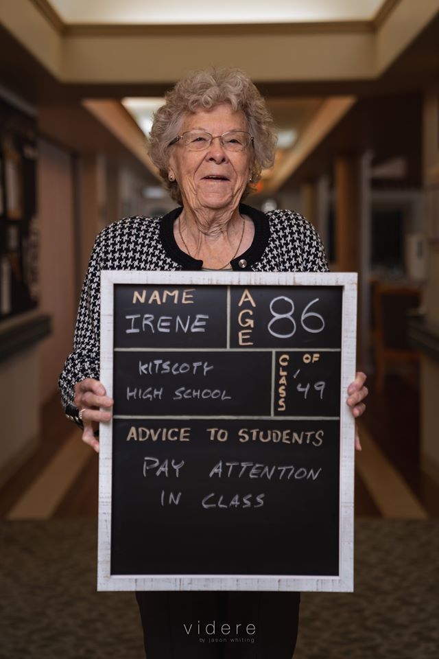 Retirement home resident Irene Knowlson, 86, took part in the photo shoot. She said her advice for kids to “pay attention in class” was the first thing that came to her mind.