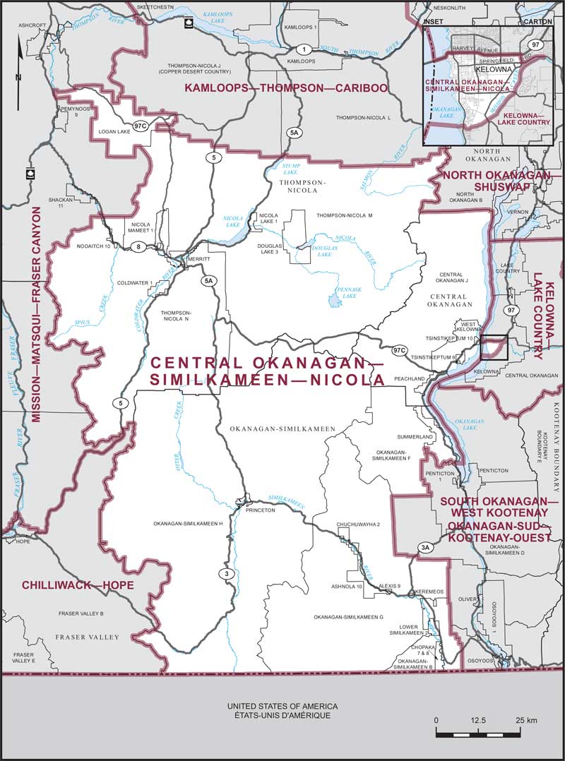 The riding covers West Kelowna, Peachland, Summerland, Keremeos, Princeton, Merritt and a small part of Kelowna.