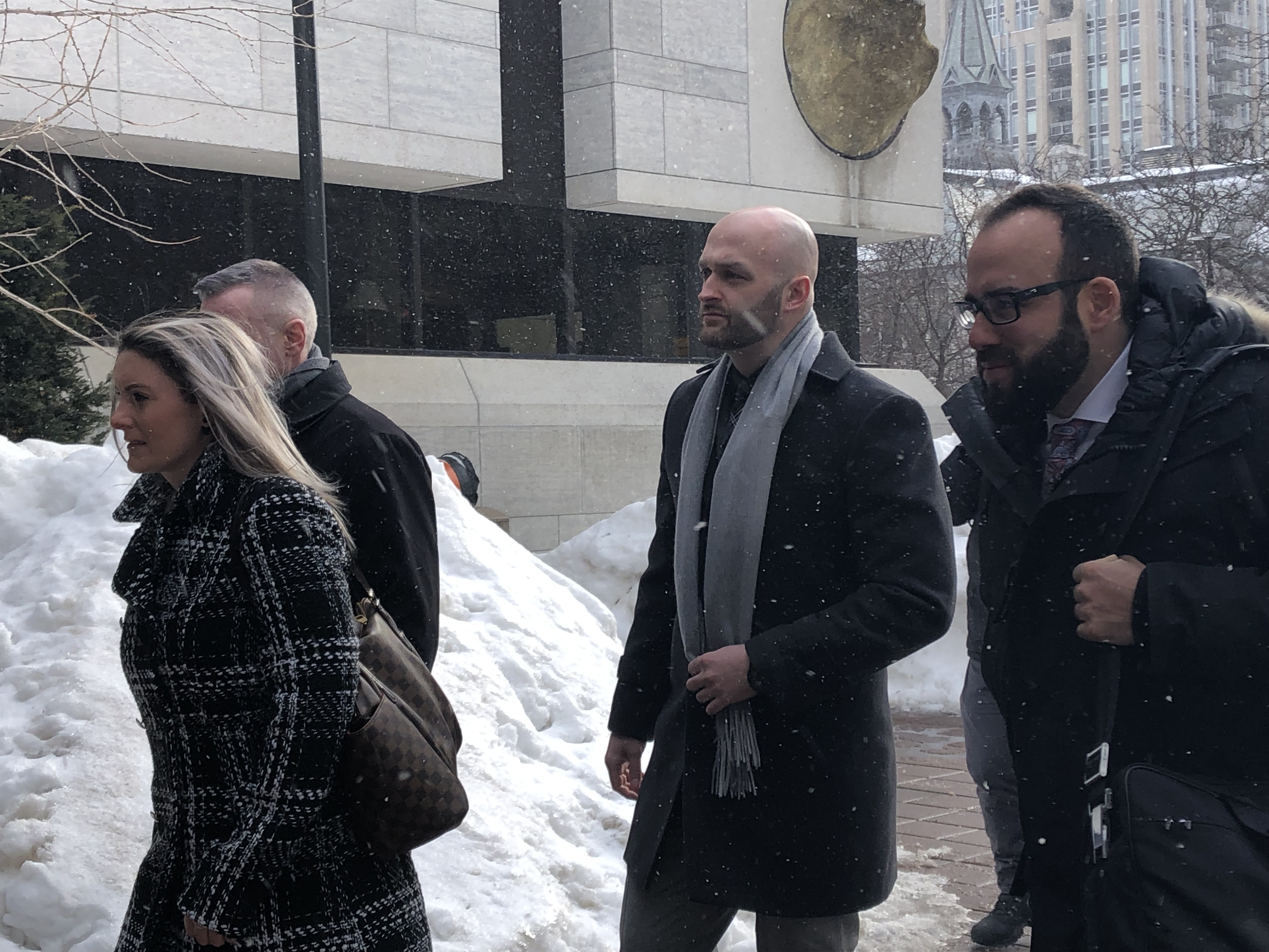 Const. Daniel Montsion (centre) arrives with his defence lawyer Solomon Friedman (right) at the Ottawa courthouse on Elgin Street on Feb. 25, 2019. Beatrice Britneff / Global News