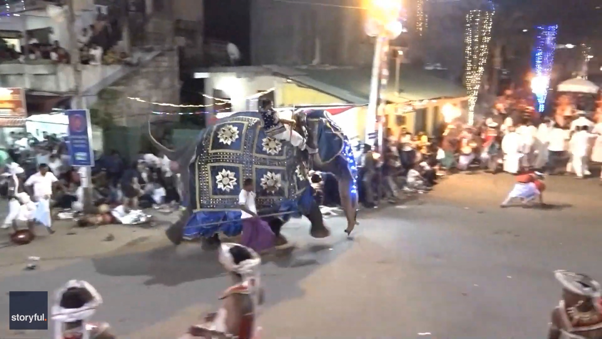 Video on Derana Television of Saturday night’s pageant in Kotte, near Colombo, showed an elephant in a procession suddenly running forward. Terrified people scattered, with some running into an elephant at the front of the procession. That elephant became violent and ran, pushing onlookers. A man riding on the elephant fell off and narrowly escaped being trampled.