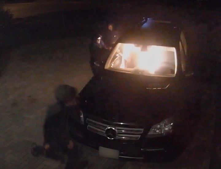 Surveillance video released by police shows three men wearing dark clothing walking up to a car and smashing the passenger side window.