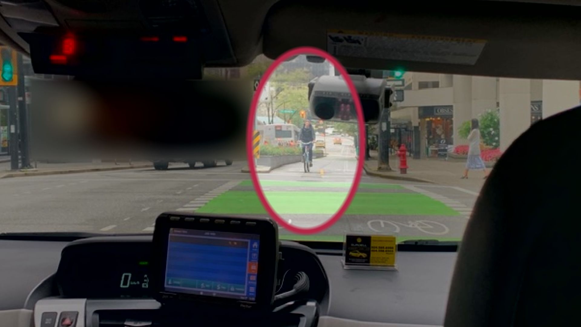 In the video, the cab can be seen travelling along the Dunsmuir bike path for about two blocks before merging back into normal traffic near Burrard Street.