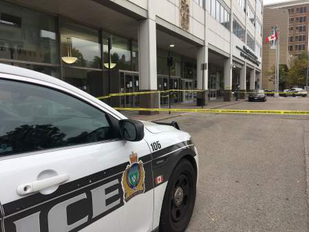 The police headquarters and Garry Street were blocked off to pedestrians while police investigated Thursday morning.