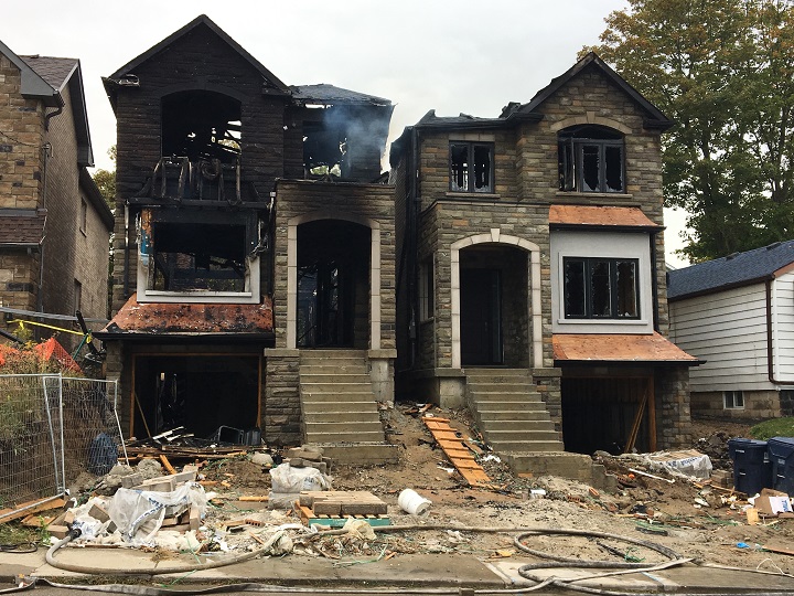 Toronto Fire said there was a partial collapse at the rear of the first home and that strong, heavy winds made it difficult to battle the fire.