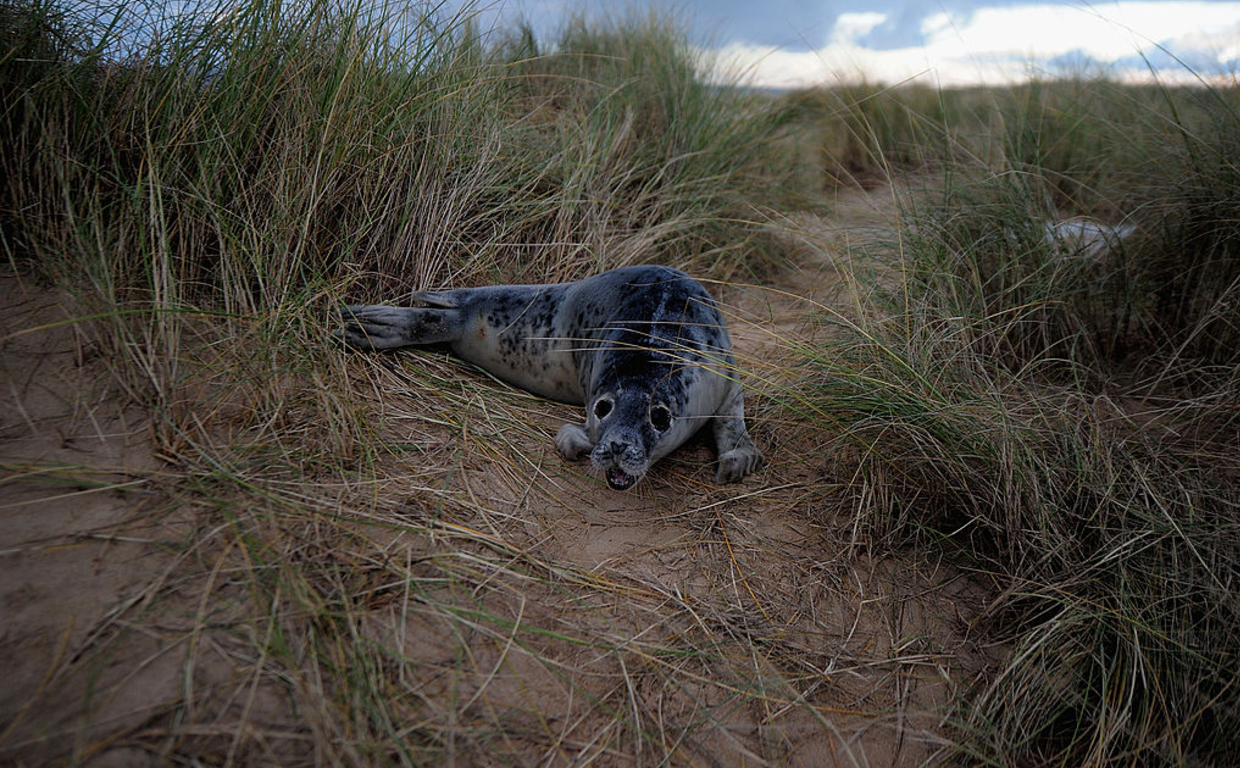 After being spotted, police say the suspects attempted to escape but were stopped by a massive sleeping seal blocking their path.