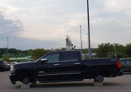 The most notable theft was featured in a photo posted on Reddit from user phirleh, taken Tuesday, Sept. 10 around 6 p.m. showing a black 4×4 Chevy Silverado with all of its wheels removed.