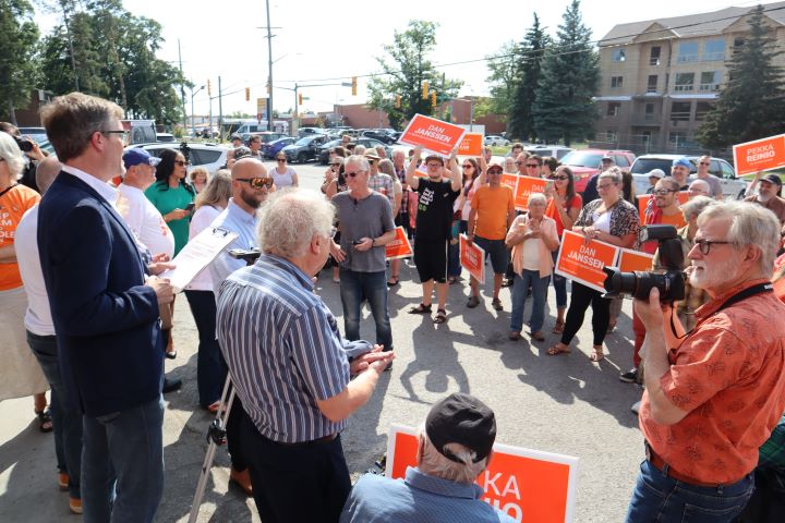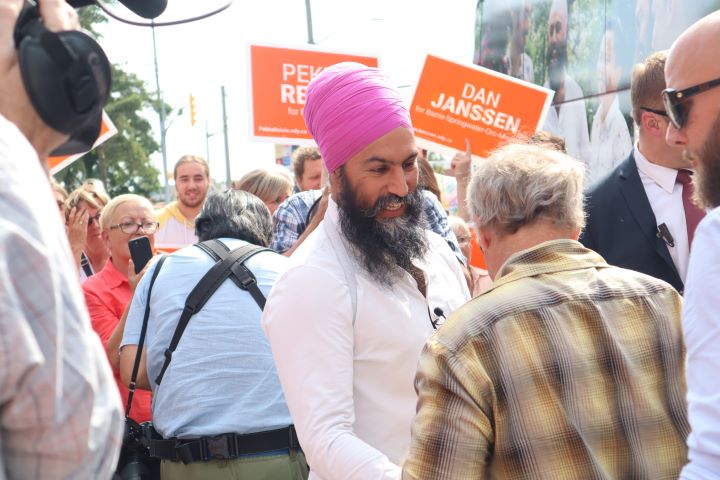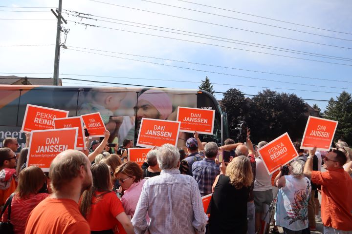 NDP Leader Jagmeet Singh stopped in Barrie on Wednesday afternoon to meet supporters, while standing alongside Barrie–Innisfil candidate Pekka Reinio and Barrie–Springwater–Oro-Medonte candidate Dan Janssen.