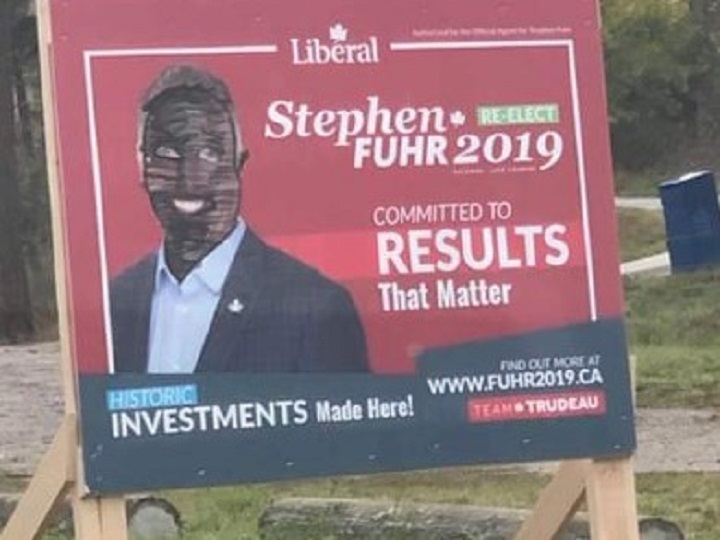 The signs for Liberal incumbent candidate Stephen Fuhr were defaced by someone who drew over Fuhr’s face with a black marker.