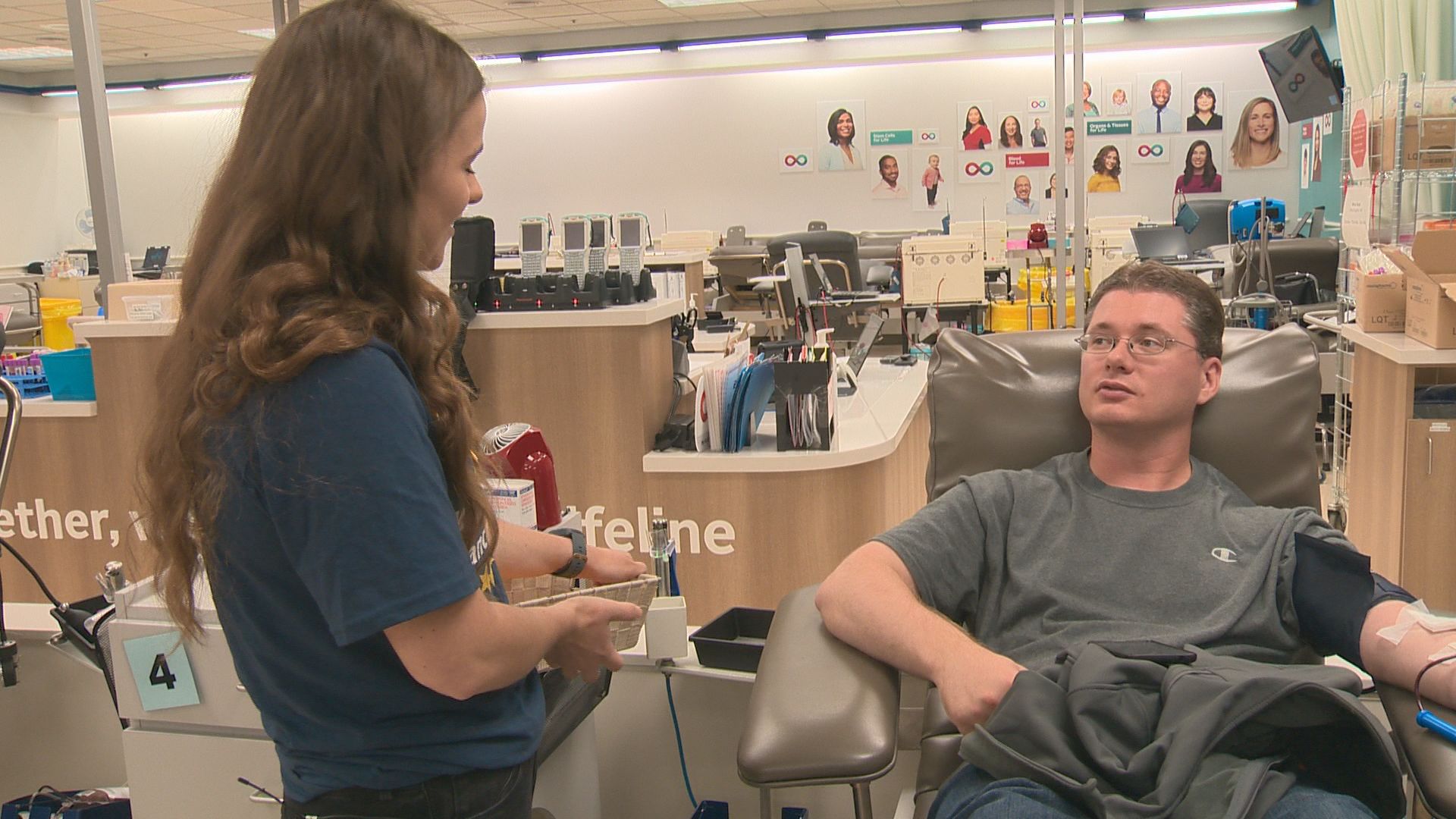 When donors arrive at the clinic, they’re greeted by a person who guides them to check in using an electronic kiosk. The technology allows people to not only sign in for their appointment, but book their next appointment.