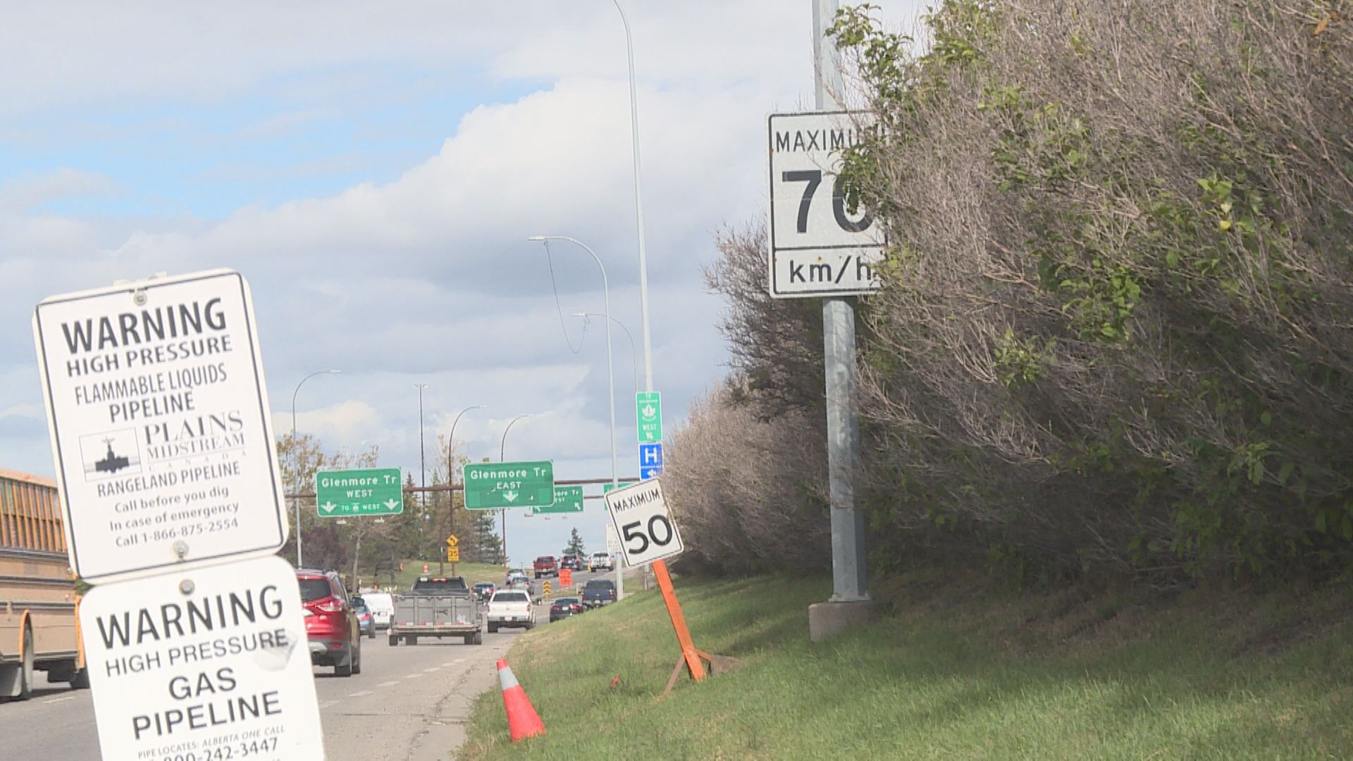 Northbound on 14th Street, just ahead of the eastbound Glenmore Trail exit, speed limit signs of 50 km/h and 70 km/h sit side by side.
