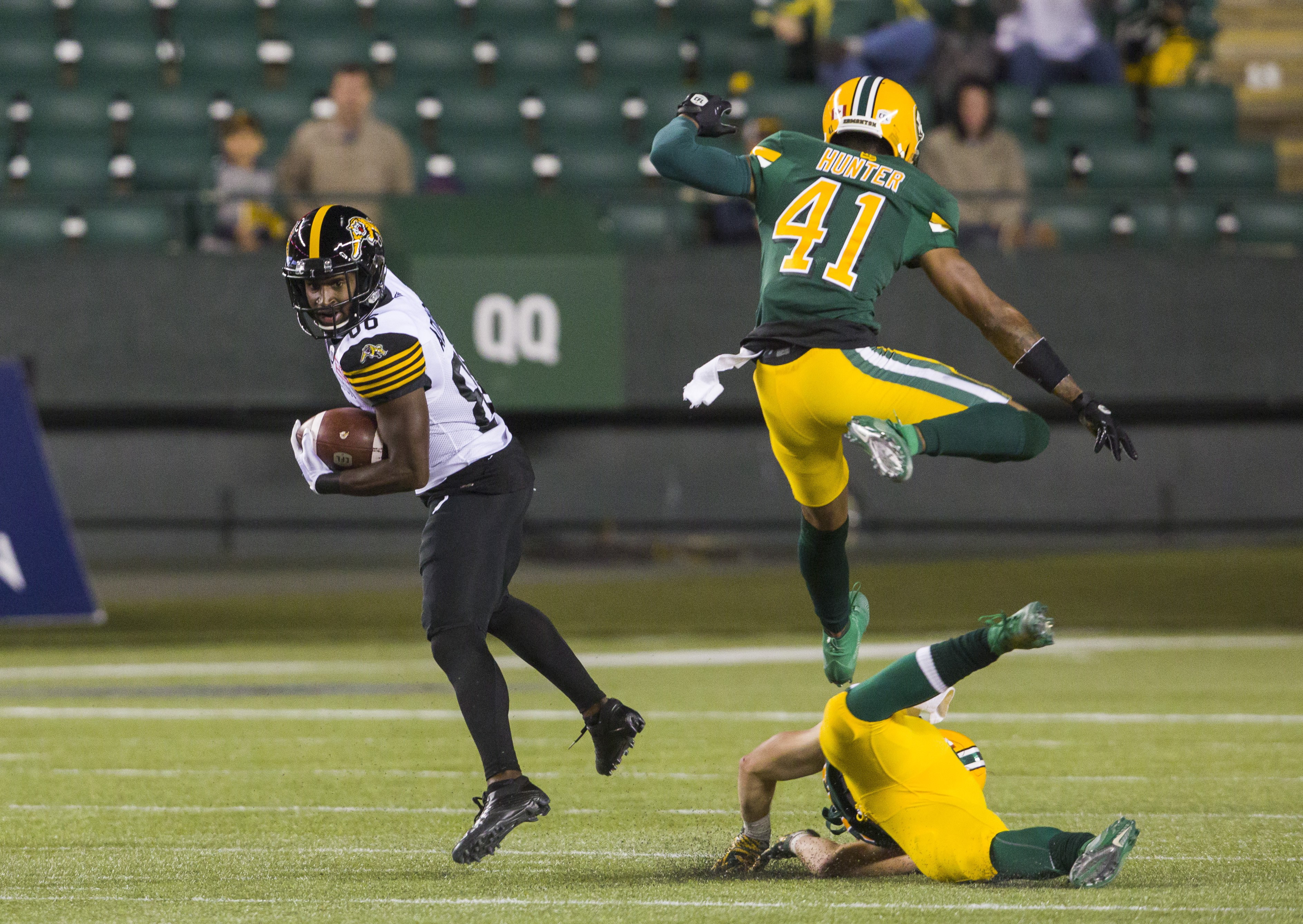 Hamilton got on the board first with six minutes left in the opening quarter when Brandon Banks reeled in a short Dane Evans pass and turned on the jets for a 42-yard touchdown. Anthony Coombs then caught a two-point conversion.