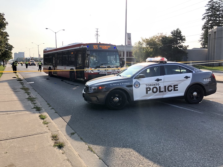 A police spokesperson told Global News a man in his 20s was hit by a TTC bus in the area and was taken to hospital with life-threatening injuries.