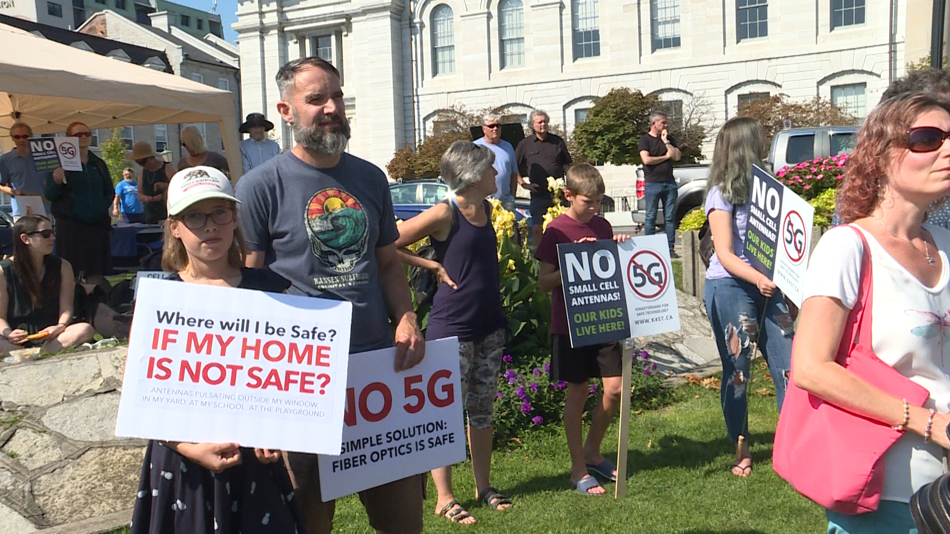 Dozens rallied outside Kingston City Hall Saturday afternoon to voice their concerns about 5G networks.