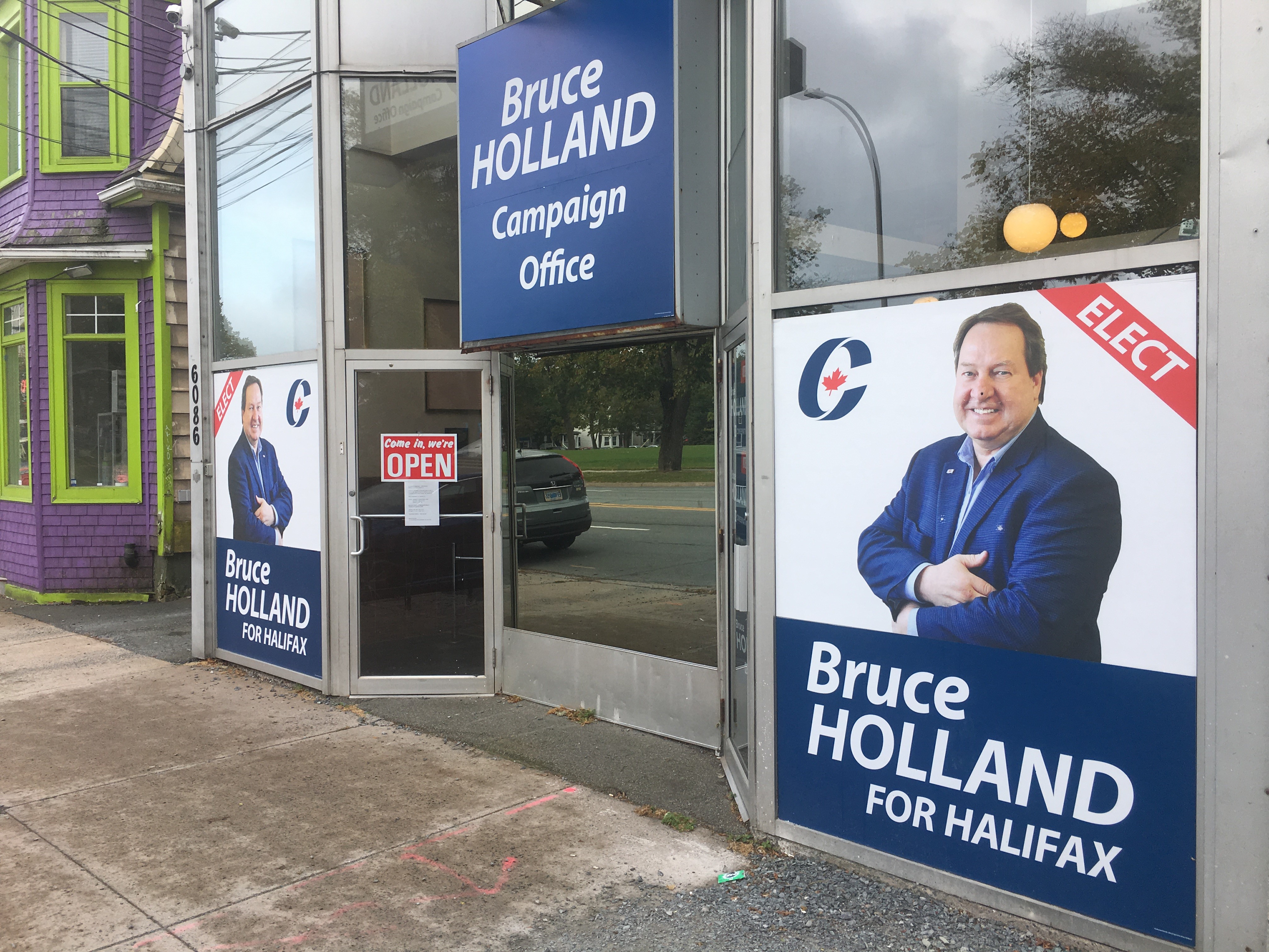 Police are investigating after the front window of Halifax Conservative candidate Bruce Holland’s headquarters on Quinpool Road was smashed with a rock.