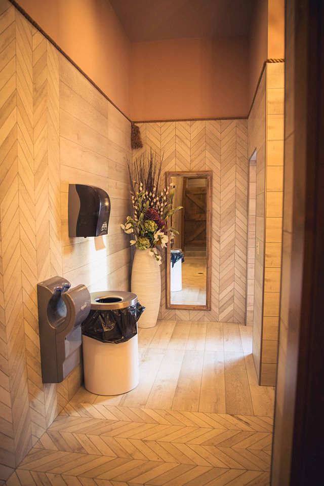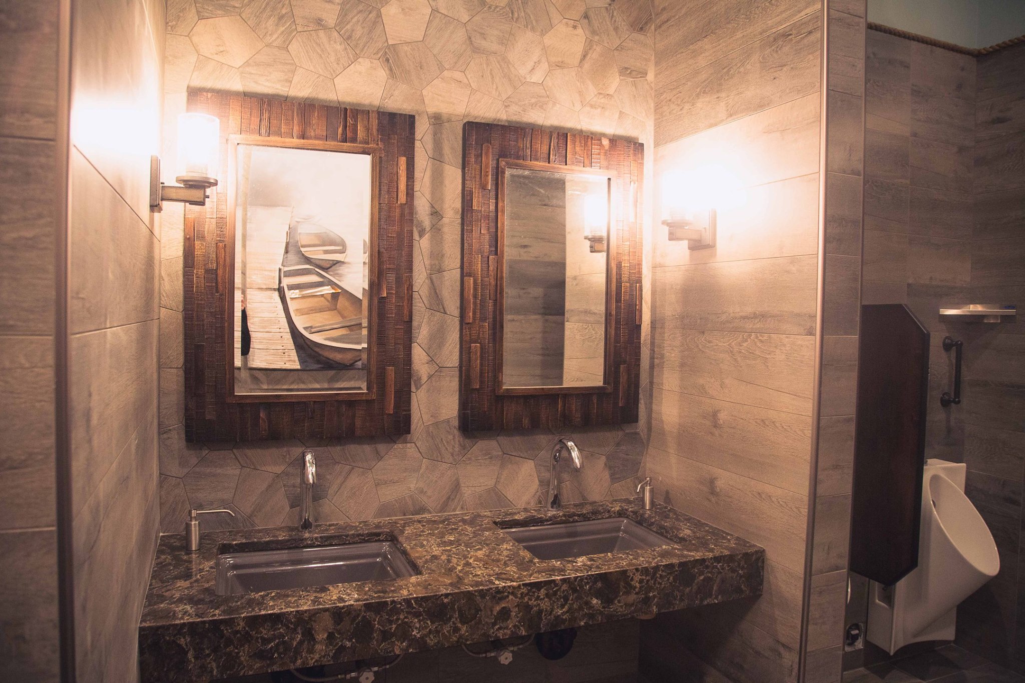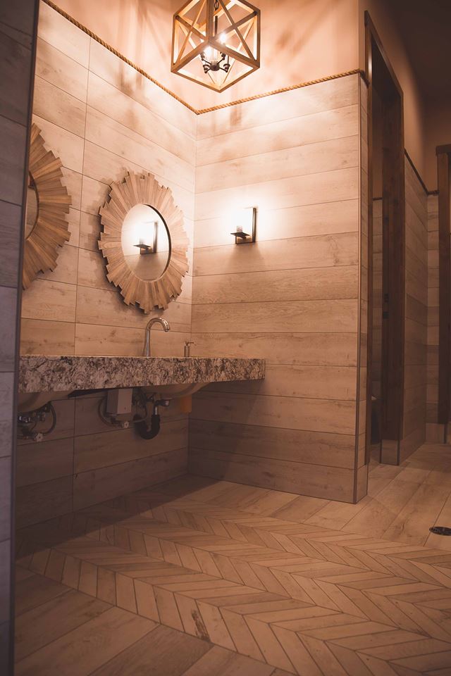 The washrooms feature granite countertops, wood framed mirrors and a herringbone floor pattern.