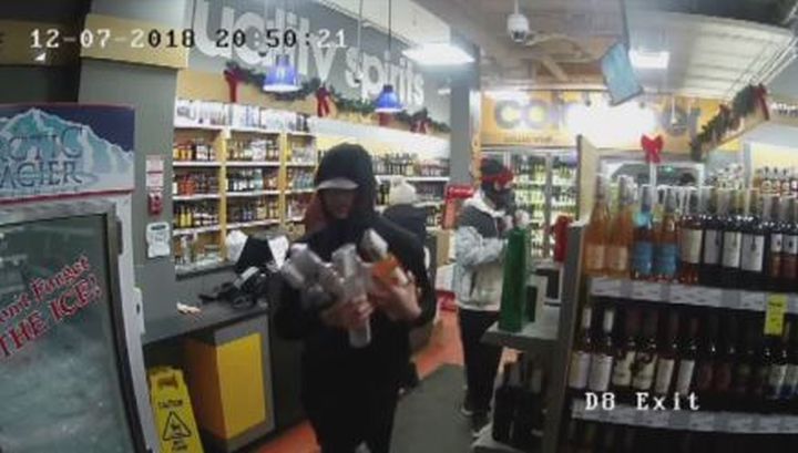 One video taken from inside a Liquor Depot shows one person stand at the front door holding a can of bear spray. A second person goes into the store, gathering up bottles of alcohol. Two staff members can be seen watching from a distance. As the person inside the store leaves, they attack the employees with bear spray.