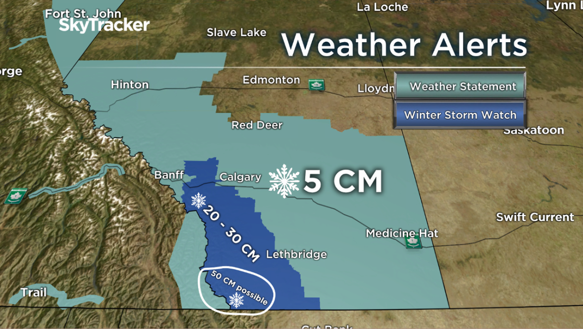 Lesser amounts are forecast for Calgary and Lethbridge, with 5 centimetres possible by Sunday morning. Snow is expected to continue into Monday for parts of Alberta.