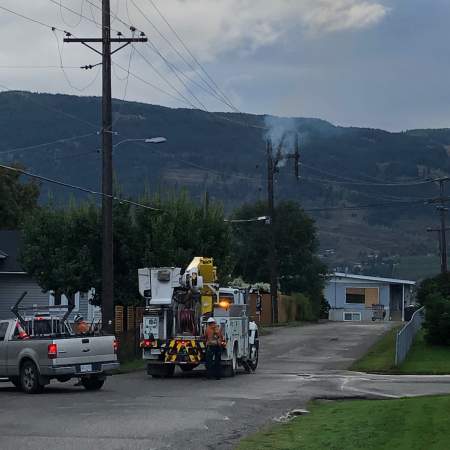 The fire-damaged power pole, according to B.C. Hydro, will need to be replaced — a process that’s expected to take four to six more hours as of just before 9 a.m., the utility said.