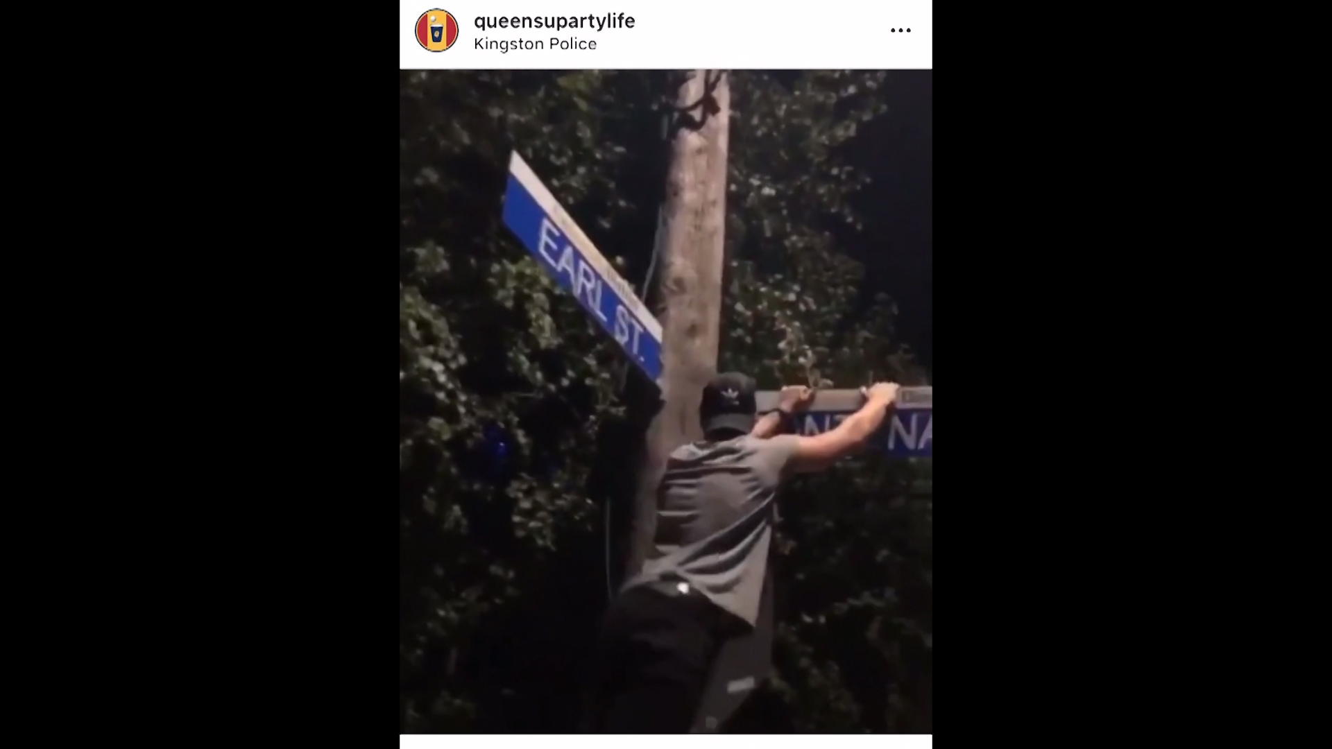 Police warn that while it may seem like fun and games to the students in the video, ripping down street signs is considered theft of city property.