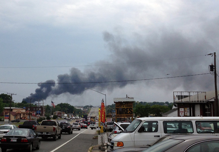 A thick plume of black smoke was emerging from the scene and was visible for miles, the smoke drifting across the Baltimore city line and covering the eastern part of the city. It was visible to motorists heading north on Interstate 95, through downtown Baltimore. More than one video posted to Facebook shows the fire, then minutes later, an explosion rattling the area.