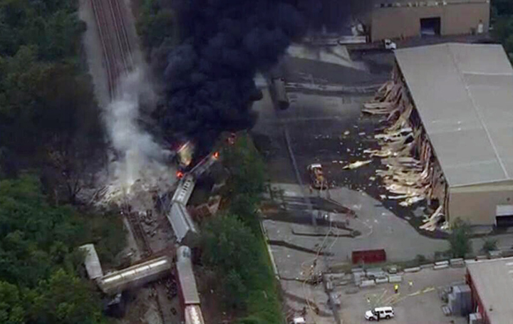 Photos and video on TV stations showed at least three rail cars off the tracks. Overhead news shots show several blackened buildings and fires burning. Rogers Feher said several buildings “fell apart.” They also showed a tractor-trailer overturned near the front of the crash.