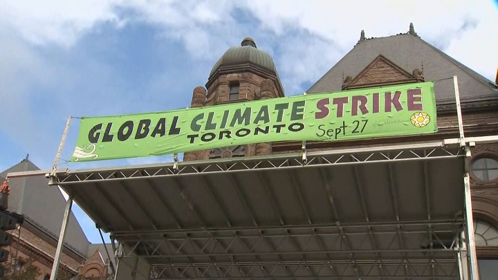 Thousands of people took over the area in and around Queen’s Park in the city’s downtown core on Friday to take part in a climate strike rally for climate justice.