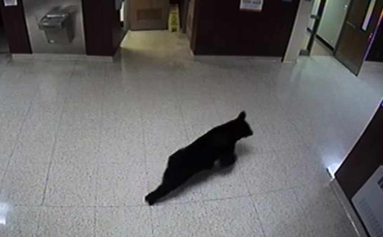 In video footage obtained through the school’s CCTV system, the bear can be seen wandering the halls and looking inside classrooms.