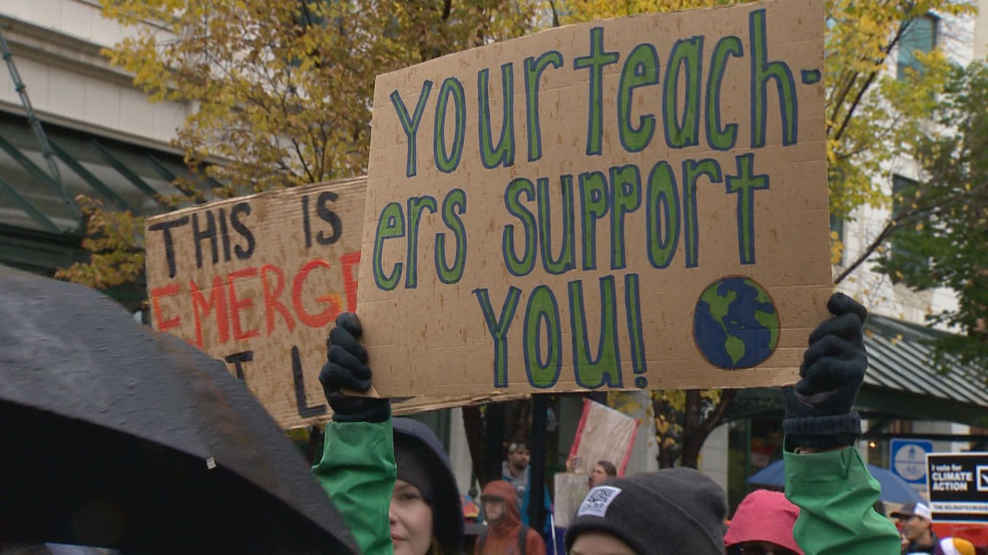 Students joined others in the Fridays For Future rally outside City Hall at noon. Students were also gathering outside the University of Calgary to have their message heard.