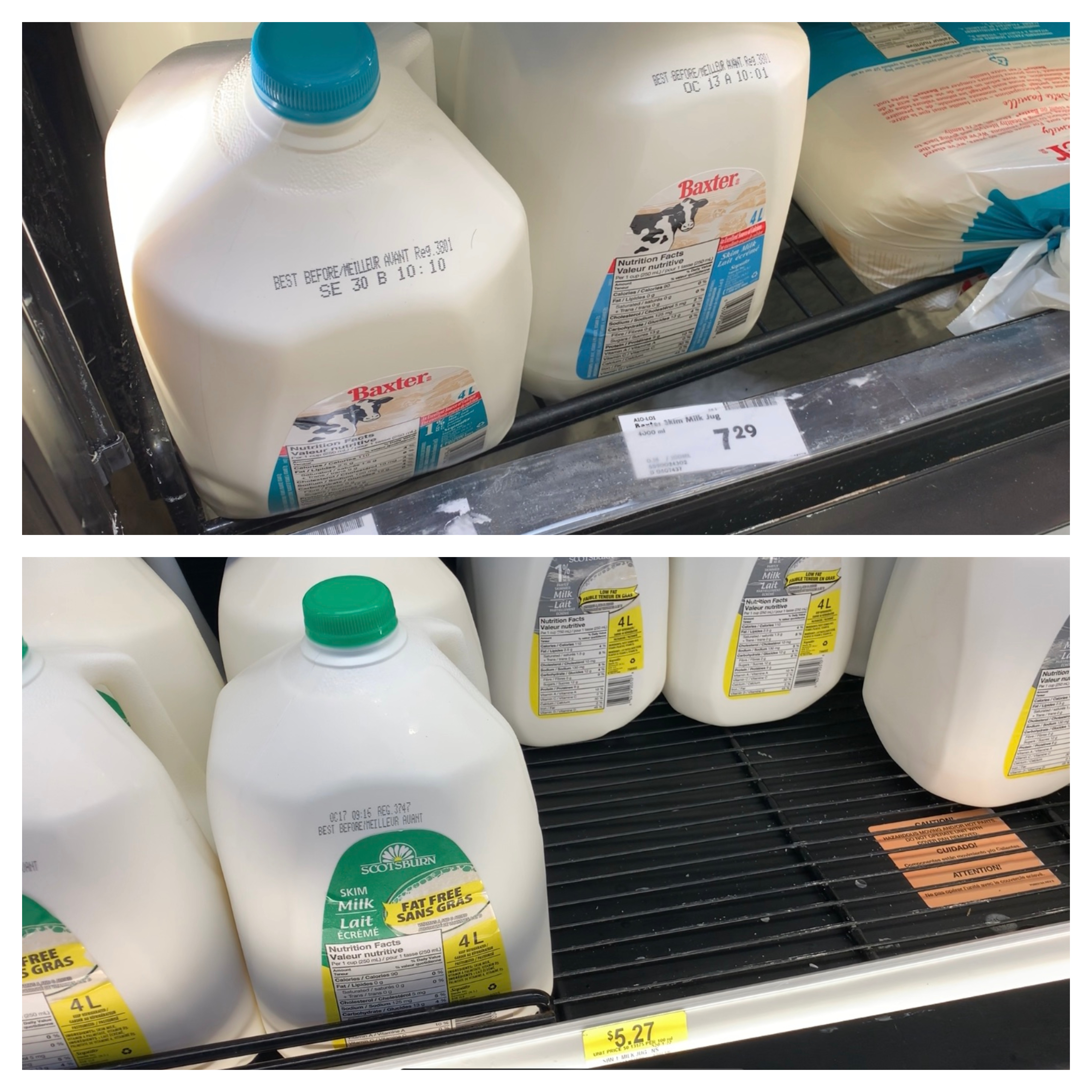 Going through some stores in both provinces Sunday, Global News found one big box store in Moncton was selling four litres of milk for $7.29 compared to one in Amherst that had a $5.27 price tag on a four-litre jug of milk.
